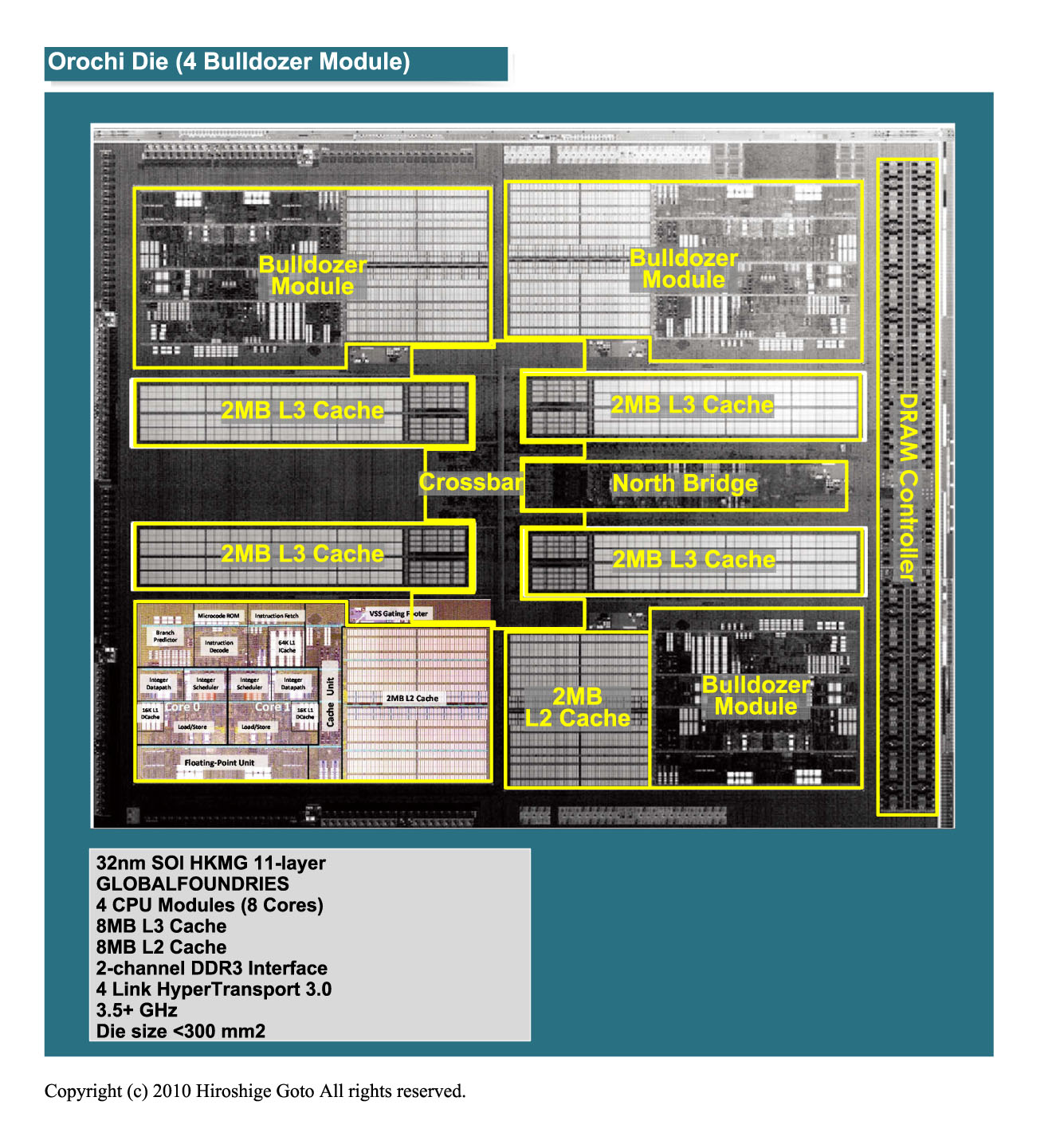 위가 이번에 공개 된 Bulldozer 코어 CPU 다이 "Orochi (오로치)"의 사진이다. Orochi는 Bulldozer 기반의 첫 번째 다이에 GLOBALFOUNDRIES의 32nm SOI 공정 (High-K/Metal Gate)에서 제조된다.