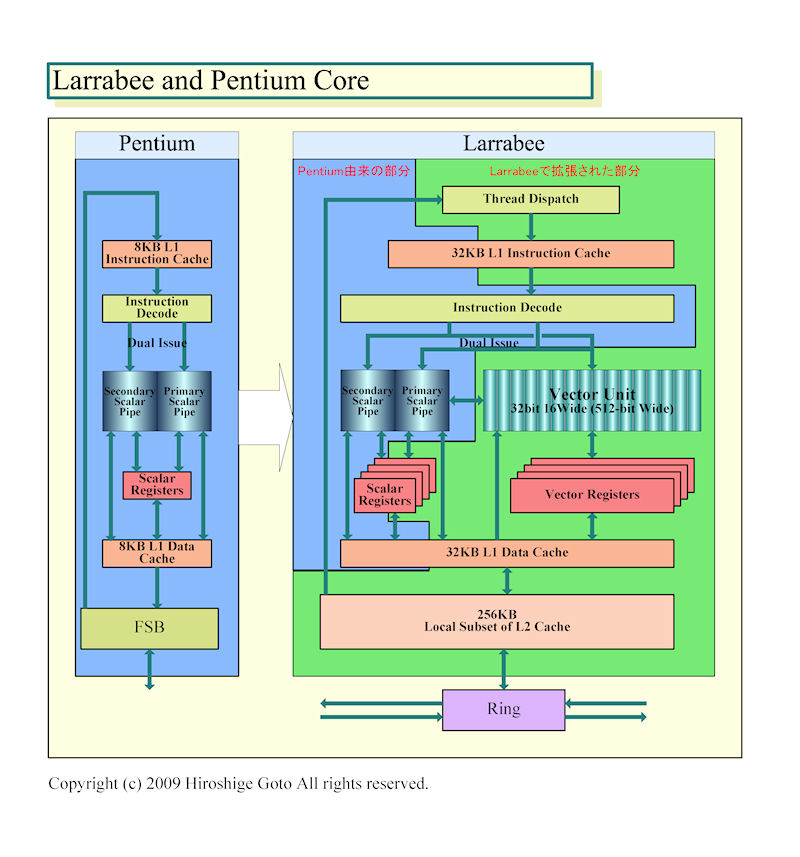 한편, Intel이 기존 그래픽 API에 최적화된 아키텍처로 전환 가능성은 낮다고 추측된다. 그것은 Larrabee 본래의 목적에서 벗어나 버리기 때문이다. 본래의 목적, 그것은 막다른 범용 슈퍼 스칼라 CPU를 헤테로 지니어스 (Heterogeneous : 이종 혼합) 프로세서로 전환시키는 것이다.