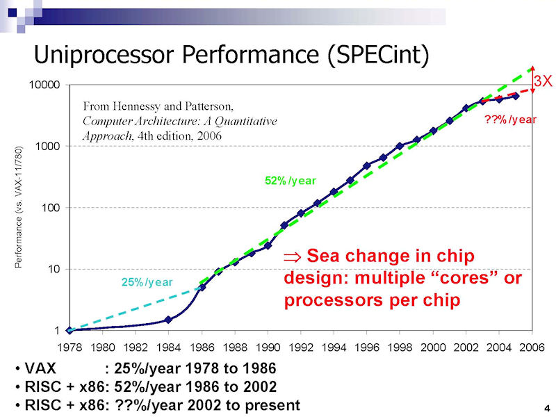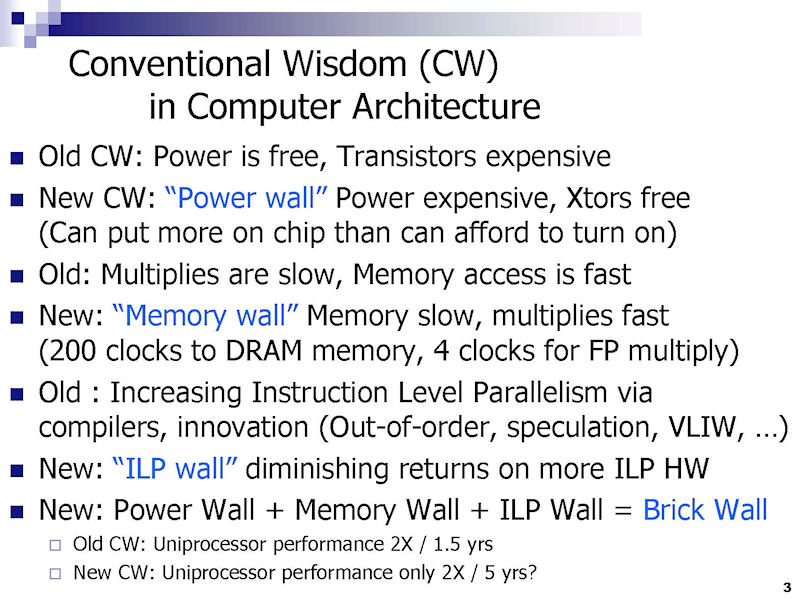 이러한 해법이 필요하게 된 것은 현재 CPU가 3개의 벽(월)에 부딪치고 있기 때문이다. 이 3개의 벽은 CPU 업계에서의 교과서라 말할 수 있는 책 "Computer Architecture : A Quantitative Approach, 4th edition"에 자세히 설명되어 있다. 명령 레벨의 병렬성인 ILP (Instruction-Level Parallelism)의 한계 "ILP 월 (ILP Wall)", 소비 전력의 벽 "파워 월 (Power Wall)", 메모리 액세스의 벽 "메모리 월 (Memory Wall)" 이다. ILP를 올리기 위해서 하드웨어를 추가해도 이전 정도의 성능 향상은 얻을 수 없다. 한편, 전력 절약화가 막히면서, 전력이용을 올리지 않으면 CPU 성능을 올릴 수 없게 되었다. 또한 메모리 성능이 오르지 않는 것도 발을 잡아끈다. 아래는 Computer Architecture의 공동 저자로 유명한 David A. Patterson (데이비드 · A · 패터슨) 교수 (University of California at Berkeley)가 2006년 8월 CPU 컨퍼런스 "HotChips 18"에서 설명한 슬라이드다.