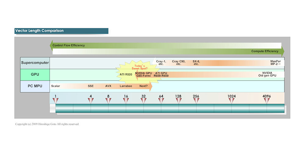 이 균형은 애플리케이션 워크로드에 대해 어느것이 최적인가를 판별해 결정할 필요가 있다. 현재는 NVIDIA가 32-way, AMD GPU가 64-way가 되고 있다. 즉, 원리 적으로는 Intel이 제일 컨트롤 플로우의 유연성은 높지만, 컴퓨팅 효율이 가장 나쁘다.