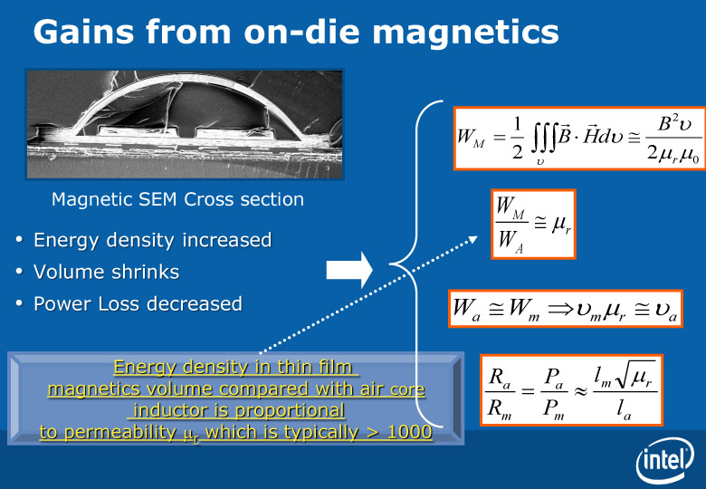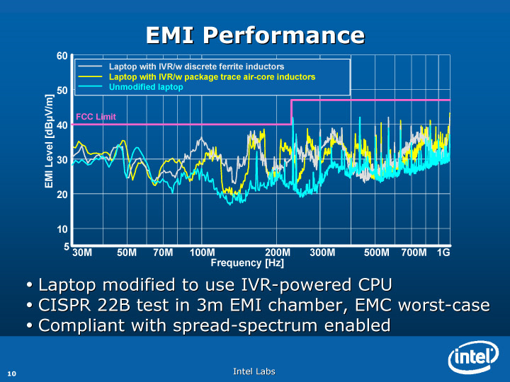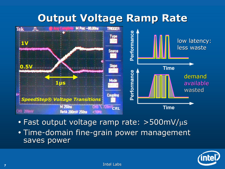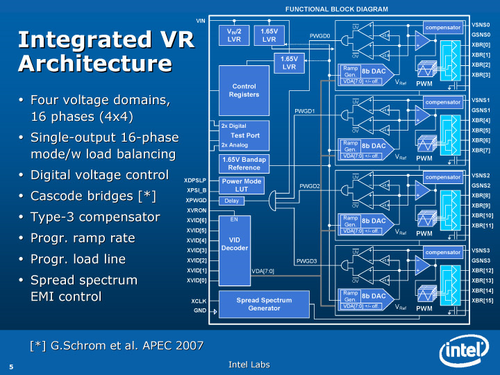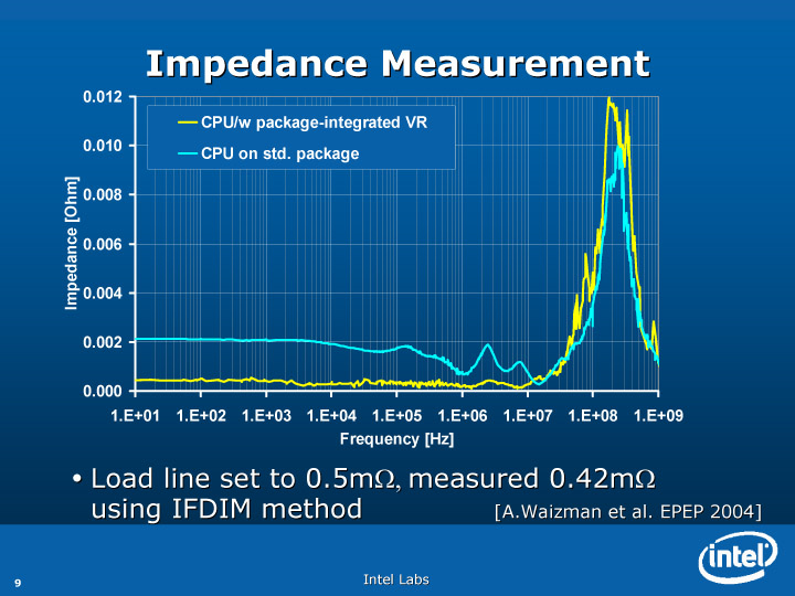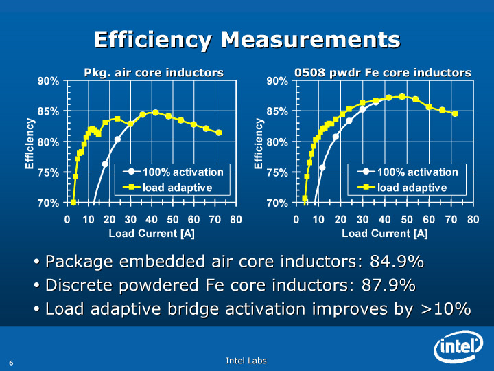 이때 테스트 칩은 단순히 외부 VR을 전제로 한 Core 2에 연결하는 것이었다. VR 자체는 여전히 CPU에 통합되지 않았다. 그러나 스위칭 주파수는 60MHz 빠르고, 인덕터의 효율은 84.9 %로 외부와 거의 손색이없고, 전압 램프도 0.5V에서 1V에서 1us (마이크로 초)로 좋은 스펙이었다.