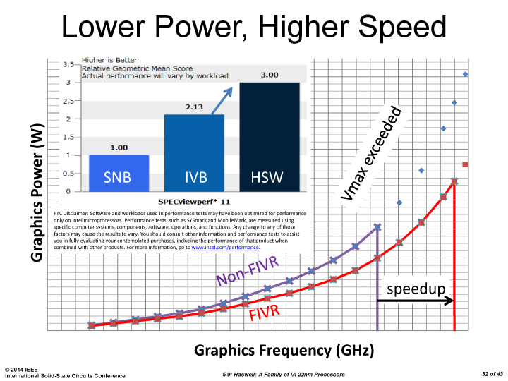 ISSCC는 Haswell의 FIVR 에서는 Unity Gain Bandwidth (UGB)이 80MHz에 도달, 전류 밀도도 32A / 제곱 mm로 고밀도인 것이 밝혀졌다. 다이 비용면에도 저비용으로, 패키지 측도 특별한 재료가 필요 없기 때문에 상대적으로 저비용으로 생산할 수 있다는 것이다. 풀로드시의 컨포지트 효율도 90%를 유지한다.