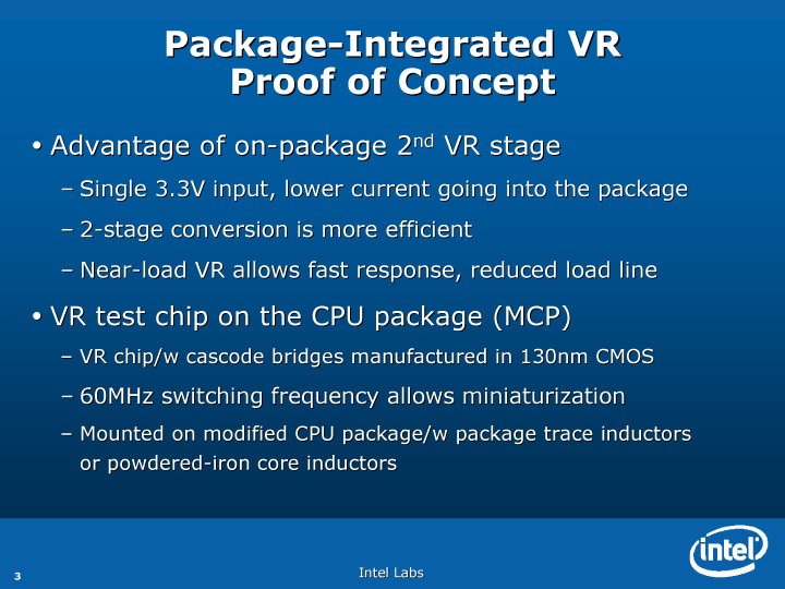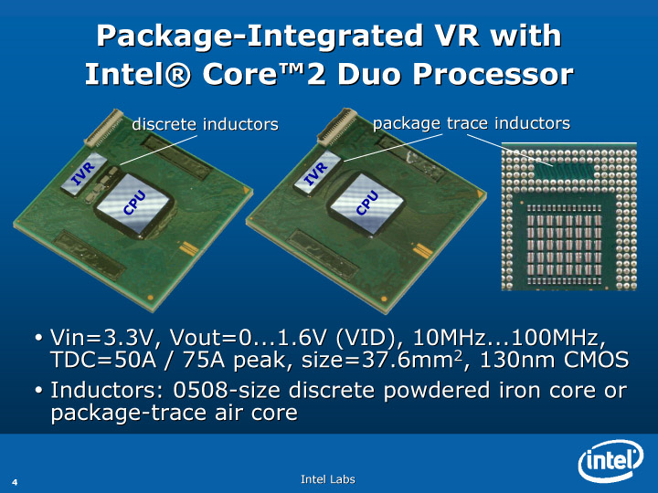 Intel은 이 기술에 대해서는 과거 Core 2 Duo를 사용한 테스트 패키지를 공개했다. 아래의 슬라이드 사진이 테스트 칩으로 왼쪽의 사진에서는 CPU와 전압 레귤레이터의 실리콘 칩 사이에 외부 인덕터가 오른쪽 사진에서는 VR 실리콘 아래에 패키지 트레이스 인덕터가 생성되어 있다.