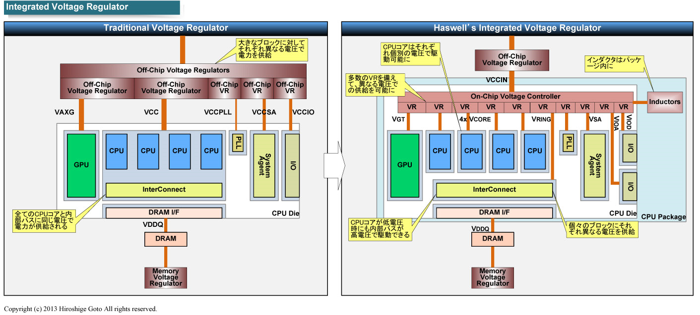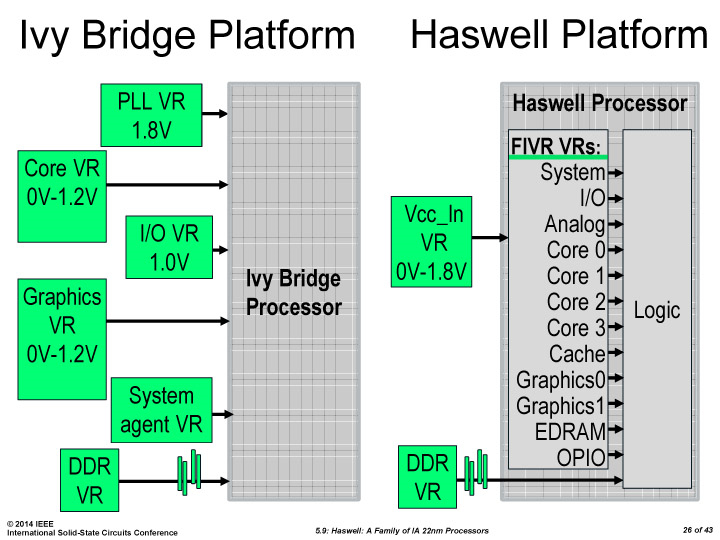Ivy Bridge는 (CPU 외부의 마더보드)VR에서 6개의 레일로 전력을 공급하고 있었다. Haswell에서는 외부에서 레일 VccIN 외에는 DRAM과 DRAM 인터페이스에 공통되는 DDR VR 뿐이다. 그리고 CPU의 각 유닛으로의 전압 레일은 유닛마다 미세 입도화 되었다. 기존의 Intel CPU에도 각 CPU 코어는 부하에 따라 전압과 동작 주파수를 바꾸는 "DVFS (Dynamic Voltage and Frequency Scaling)"을 행하고 있었지만, CPU 코어 블록 전체에 공급하는 전압은 공통이었다. 따라서 DVFS의 본래의 강한 맛은 활용되지 못했다.