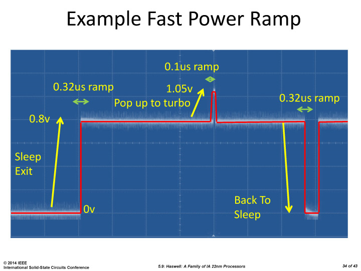 140MHz라는 스위칭 주파수는 통상의 오프 칩(메인보드에 있는) VRM이 수 100KHz ~ 수 MHz 인 것과 비교하면 꽤나 고속이다. 이전의 패키지 트레이스 인덕터의 테스트 칩과 비교해도 스펙은 상기의 테스트 칩은 0.5V에서 1V까지 승압 1,000 ns (1us)라는 사양이었다. 전압 램프 레이트는 테스트 칩이 500mV/us였던 것에 비해, Haswell에서는 2,500 mV / us 로 5배 빠르다. 기존의 VR에 비해 극적으로 전압 변환이 고속으로 되기 때문에,지금까지라면 전압 스위칭 속도의 제약으로 인해 일정한 전압으로 연속 구동되는 등의 경우에도 미세 전압을 강압할 수 있게된다. 아래의 차트는 Intel의 차트를 알기 쉽게 정리한 것이다.