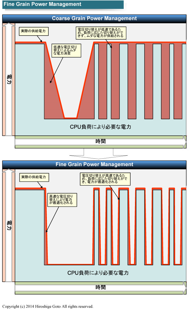 그림의 가로축은 시간, 세로축은 전력을 보여준다. CPU의 부하에 의한 전력 수요는 하늘색으로 표시되어있다. 위 차트는 기존의 오프 칩 VRM에 의한 저밀도 입도 (Coarse Grain)의 전압 스위칭이기 때문에 전환에 시간이 걸린다. 따라서 전압 전환시 낭비가 발생하고 있으며, 오른쪽의 간헐적인 부하에서는 일정 전압으로 실행할 밖에 없기 때문에 엄청난 낭비가 발생한다. 그것은 아래의 통합 전압 레귤레이터에 의한 세밀한 제어가 되면 부하에 따른 전압 제어되고, 전력의 낭비는 거의 생기지 않게된다. 이것이 Haswell에서 실현 될 수 있었던 것이다.