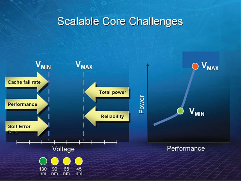 CPU는 최고의 성능을 얻고 싶은 경우는 허용 한도 상한 전압 "Vmax"으로, 전력 소비를 가장 내리고 싶은 경우에는 허용 한도 하한 전압 "Vmin" 으로 설정합니다. 그런데 공정 세대가 진행 트랜지스터가 소형이 되면 게이트 산화막 두께가 얇아져 신뢰성 면에서 고전압으로 구동 할수 없게 된다고 한다. 결과 Vmax를 낮추지 않으면 안된다.