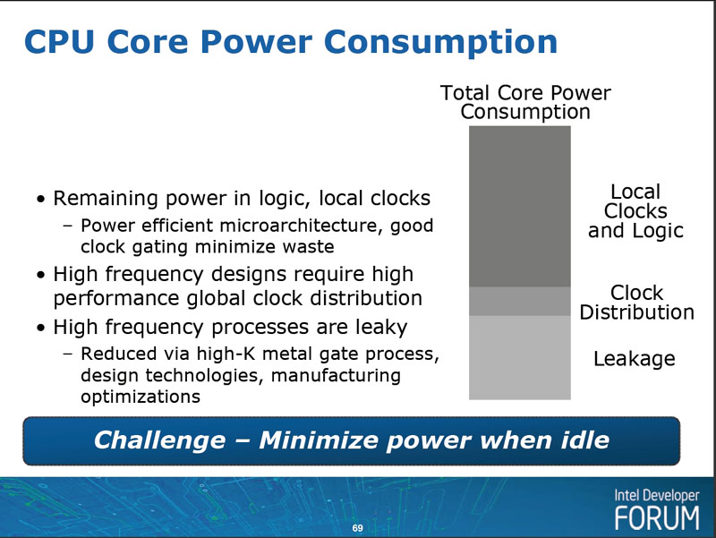 그러나 공정 기술의 진보와 함께 트랜지스터의 누설 전류 (Leakage)가 증가. 클럭 게이팅으로 전력 소비 중 활성 성분만을 차단해도 나머지 정적 성분을 억제 할 수 없기 때문에 절전 효과가 떨어지고 말았다. 아래가 IDF에 표시된 Intel CPU의 전력 소비 분석에서 누설 전류가 1 / 3을 차지하고 있는 것을 알 수 있다.