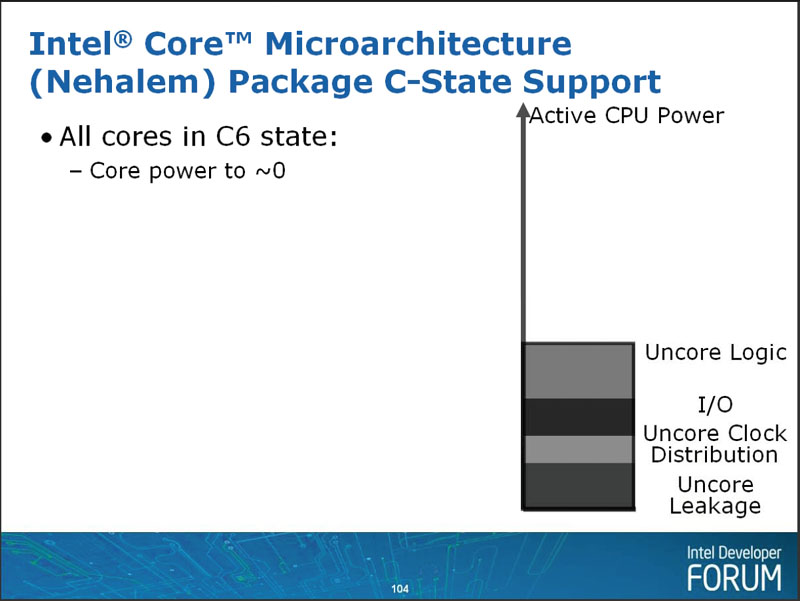 Nehalem에서는 모든 CPU 코어가 C6 스테이트에 들어가면, CPU 전체가 C6 스테이트에 들어가 전력이 더욱 억제된다. 먼저 CPU 안에 CPU 코어 이외의 "언 코어 (Uncore)"부분의 전력이 중단되고 I / O가 저전력 스테이트에 들어간다. 언 코어 부분의 클럭 그리드가 중지되고 남는 것은 언 코어 부분의 누설 전류 등 극히 일부가 된다.