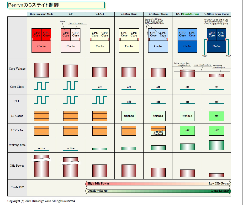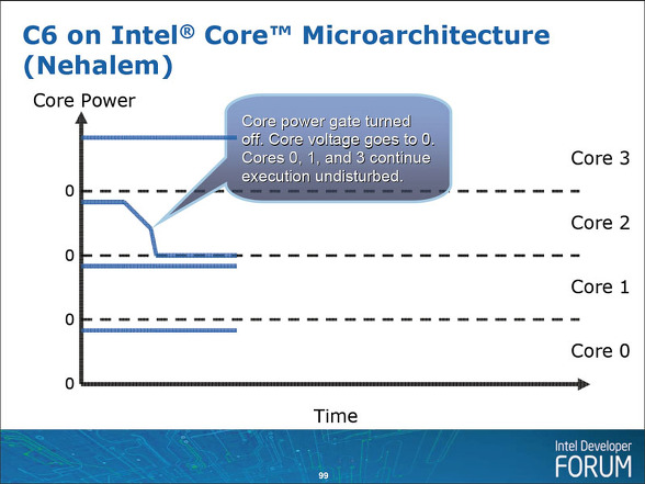 대조적으로, Nehalem에서는 CPU 코어 각각 C6 스테이트에 들어가 개별적으로 전원을 OFF 할 수있다. 따라서 매우 효율적으로 치밀 전력을 제어 할 수있다. 예를 들어, 2 개의 코어가 활성화되어 2 개의 코어가 유휴 상태면 유휴 CPU 코어는 낭비 누설 전류를 소비하지 않는다.