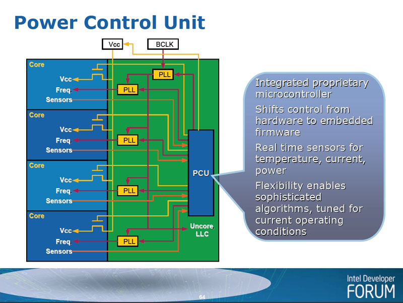PCU는 복잡한 전력 제어를 위해 탑재된 전용 마이크로 컨트롤러이다. 기존 CPU에서는 하드웨어로 행하고 있던 제어를, Nehalem에서는 전용 프로세서로 달리는 펌웨어로 전환했다. PCU는 100만 트랜지스터 이상 규모의 컨트롤러로 기존의 절전기구에서는 불가능했던 치밀한 작업을 수행한다. CPU에 탑재된 수많은 센서 모니터 결과를 바탕으로, 전력 절약 제어를 행한다. Kumar 씨에 따르면, Nehalem에서는 절전 제어가 매우 복잡하기 때문에 규모가 큰 버그가 생기기 쉬우므로 컨트롤러의 소프트웨어 제어로 전환한다. 소형 CPU 클래스 규모의 PCU의 트랜지스터 만큼, Nehalem의 소비 전력은 증가해 버리지만, 그래도 전력 제어로 억제되는 장점이 더 크다고 한다.