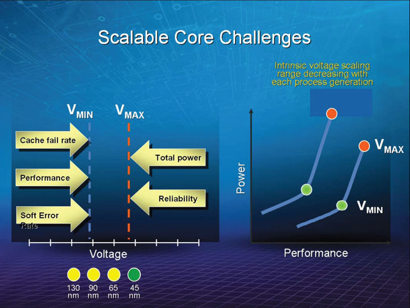 Vmax가 내려가고, Vmin가 오르기 때문에 공정이 진행되면 전압 스케일의 마진이 점점 좁아져 버리는 문제가 발생한다. 아래의 슬라이드 위가 130nm 공정, 아래가 45nm 공정의 차트이다.
