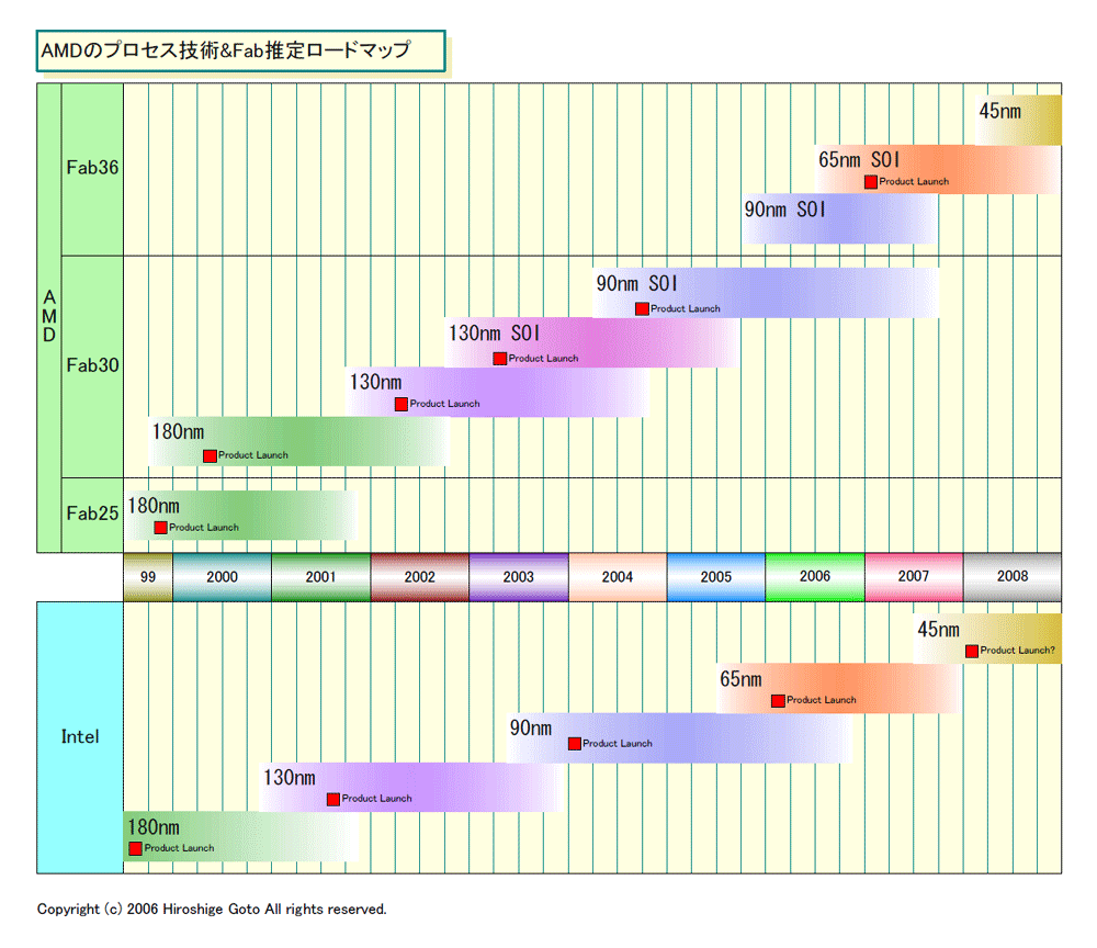 이 차트는 2005년 11월의 Analyst Day 때의 것이지만, 같은 차트를 일본 AMD가 4월 18일에 열린 공정 기술과 제조 능력의 설명회에서도 사용하고 있었기 때문에 계획이 변경되지 않아 보인다.