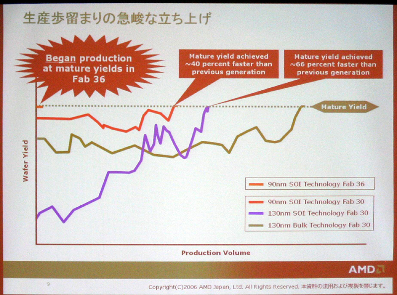 Fab 36의 출시가 빠른 이유는 몇가지 있다. 하나 분명한 것은 수율에서 AMD가 보여준 수율 차트를 보면, Fab 36의 90nm 공정은 시작시부터 성숙한 수율로 시작하고 있다는 것을 알 수있다. 이것은 AMD의 수율 및 Fab 관리 기술이 향상된 것과 관련있다. 또한 Fab 36의 출시는 이미 Fab 30에서 실행하는 것과 동일한 90nm 공정으로 시작한 것도 영향을 주고 있는 것으로 보인다.