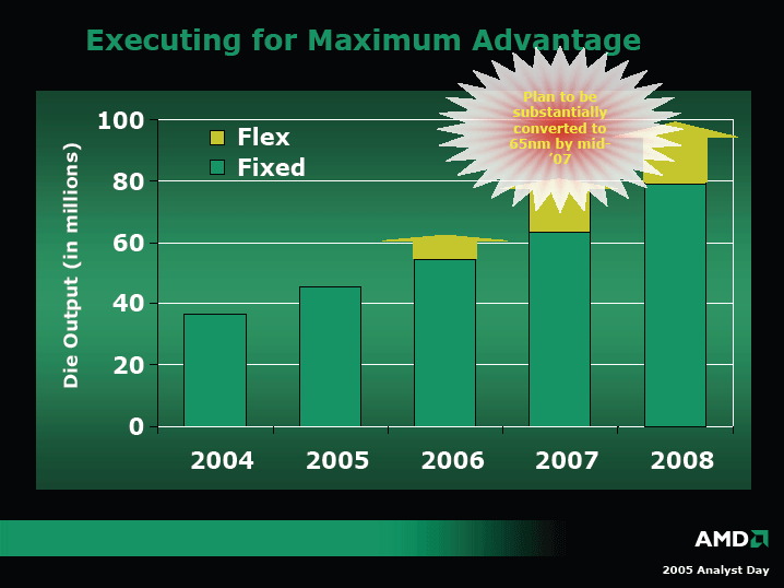 2005년 다시 20%에 달한 것으로 추정된다. 하면, Fab 30의 생산 용량은 전체를 쓰고 있다고 추정된다. 20% 대가 지금까지 AMD의 한계였다. (저 위의 24.3%는 데스크탑만의 점유율 입니다. 노트북쪽의 경우 AMD 점유율이 더 낮습니다. 노트북은 인텔의 Pentium M이 있죠. 서버나 임베디드 시장도 있구요.)