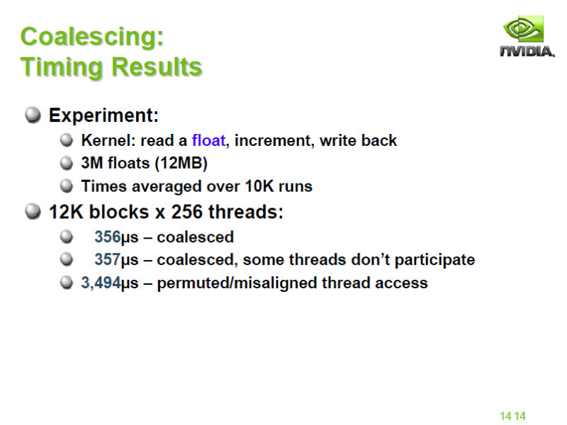 실제로는,이 비결합 (Non-Coalesced) 메모리 액세스의 하드웨어 지원을 위해 메모리 액세스 지연 시간은 약간은 연장된 것이다. 그러나 트랜잭션이 결합되므로 결과적으로 대기 시간이 단축되고 대역도 효율적으로 사용된다는 것이다. 이 부분은 CPU 비정렬 액세스 기능과 비슷한 것이다.