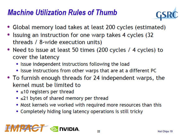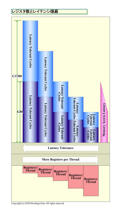GT200은 메모리 로드 명령 후 로드에 의존하는 명령이 4명령 간격으로 나타난다고 하면, 1스레드 32레지스터를 할당한 경우 16 warp 256 사이클을 은폐 할 수 있다. 따라서 스레드 당 32 레지스터가 보다 현실적이 된다. 또한 맥스 32 warp의 경우에는 16 레지스터 / 스레드로 512 사이클을 은폐 가능하다.