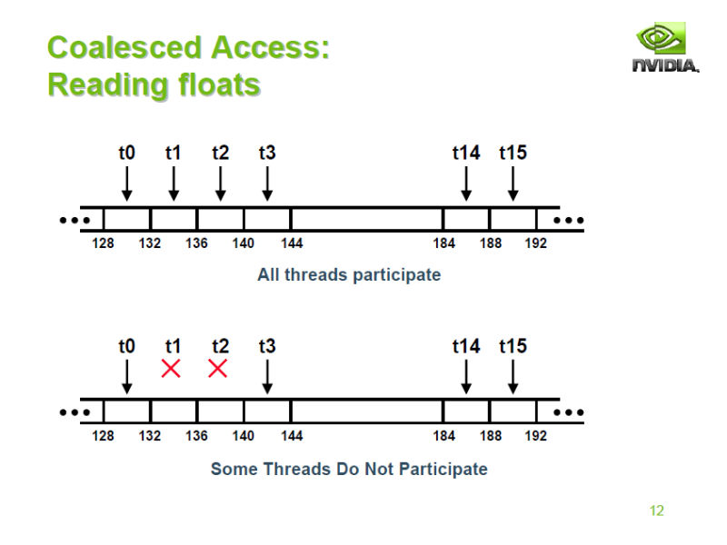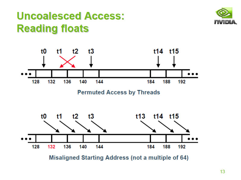 실제로 G80/GT200 계에서는 warp의 절반인 16 스레드에서 메모리 액세스를 결합시킨다. 그러나 G80의 경우는 각 스레드의 액세스 하는 메모리 주소가 바뀌는 "Permuted Access"나 액세스 할 주소의 머리가 정렬되지 않는 "미서라인드 액세스(Misaligned Access)"의 경우 패널티가 매우 컸다. 그것은 분할된 다수의 메모리 액세스 트랜잭션을 발생시켜 버렸기 때문이다.