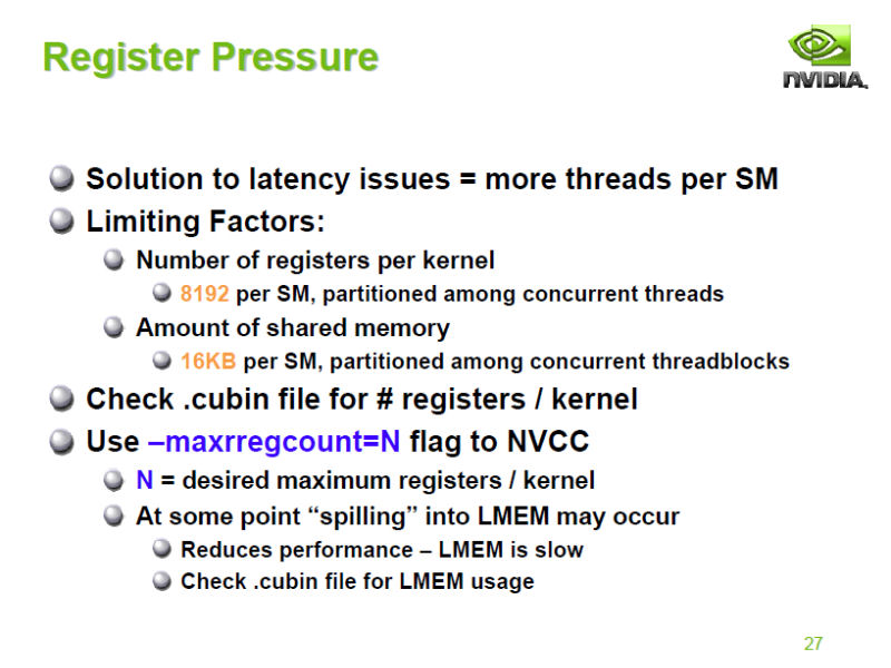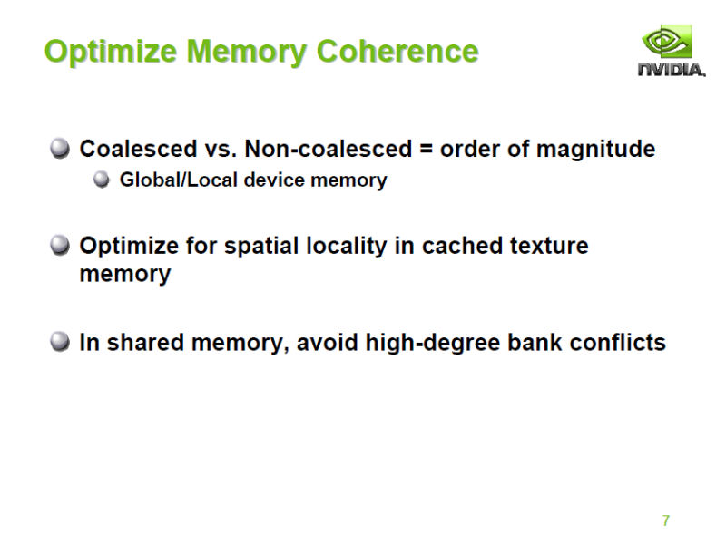 NVIDIA는 지난해 11월 미국 프린스턴에서 개최된 천문학 및 천체 물리학에서의 GPU의 응용 컨퍼런스 "AstroGPU 2007"에서 CUDA의 최적화의 포인트를 설명했다. 거기서 NVIDIA가 든 것은 레지스터의 부족에 의한 멀티 스레딩 제약 등 "레지스터 압력 (Register Pressure)"메모리 액세스의 비 효율화를 초래하는 "비결합 메모리 액세스 (Non-Coalesced Memory Access)" 여기에 GPU 내부에 갖춘 스크래치 패드 메모리에서 "공유 메모리 뱅크 충돌 (Shared Memory bank conflicts)"등이다.