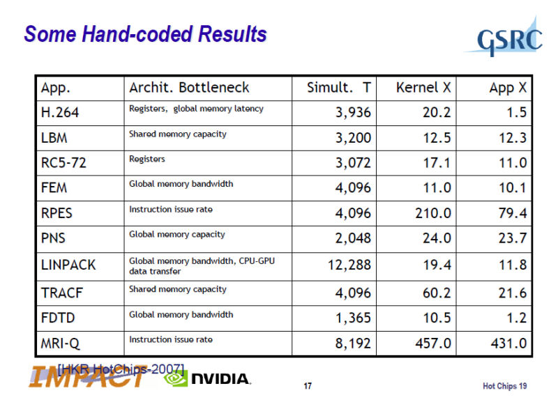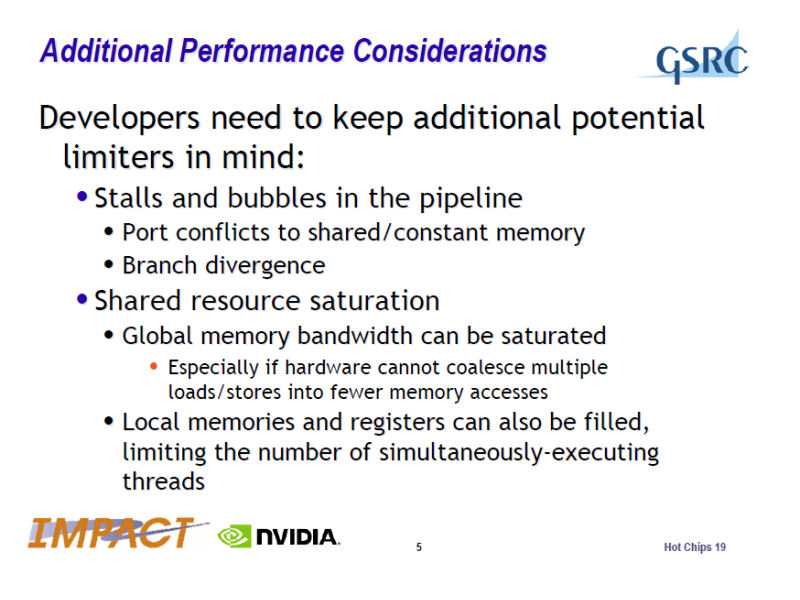 HotChips 19에서 지적된 병목은 레지스터나 비디오 메모리 액세스 지연 시간, 공유 메모리 (Shared Memory) 용량, 명령 발행 레이트 등. 단독(외장) GPU의 숙명인 CPU와 GPU 간의 데이터 전송 병목도 있지만 대부분의 경우는 GPU 측에서 아키텍처 상의 병목이 차지하고 있는 것을 알 수있다.