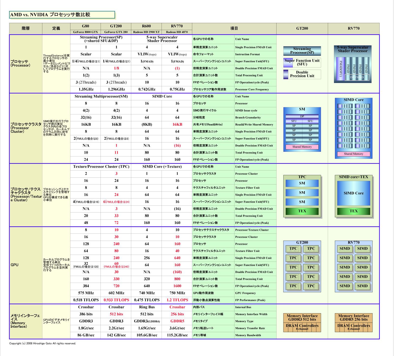 참고로, 범용 레지스터는 AMD (구 ATI)도 마찬가지로 거대한 수를 쌓고있다. 원래는 ATI 아키텍쳐가 NVIDIA 보다 스레드 당의 레지스터 수가 많았다. ATI는 R6xx 제품군 때 이미 "DirectX 9에서는 스레드 당 16에서 아마 32의 GPR로 (범용 레지스터) 액세스 했다. 앞으로 더 될 것"이라고 지적했다. RV770은 연산 유닛 수가 R620 보다 많은, VLIW (Very Long Instruction Word)에 의한 명령 레벨의 병렬성을 살리기 위해, 보다 스레드 당 레지스터를 필요로 한다.