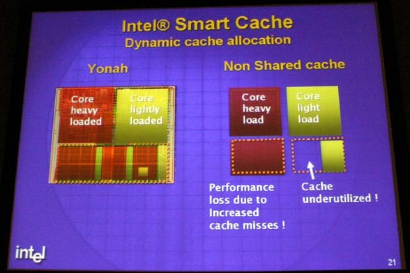 듀얼 코어로 Yonah의 가장 큰 특징은 공유된 L2 캐시에서 엿볼 수 있다. 지금까지 등장한 듀얼 코어, 예를 들면 Intel 자신의 Pentium D와 AMD의 Athlon 64 X2 등은 모두 각각의 코어에 L2 캐시를 탑재하고 있었다. 이에 비교해 Yonah는 2 개의 코어가 캐시를 공유하는 구조를 채용하고 있다.