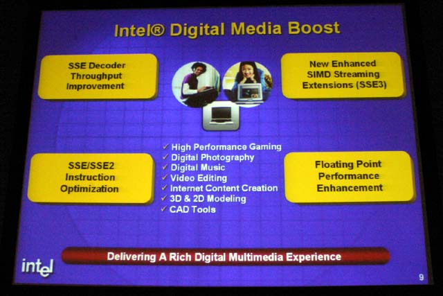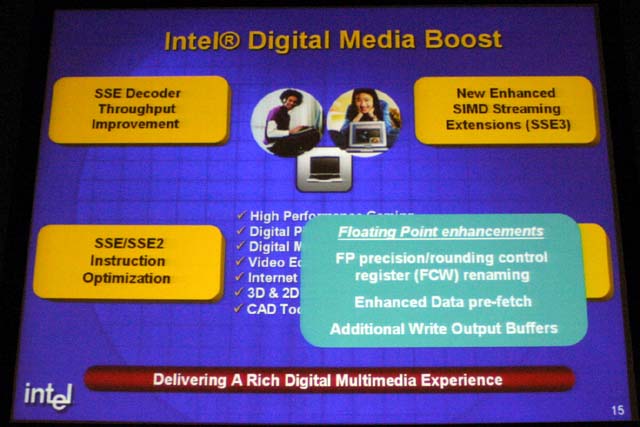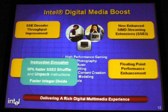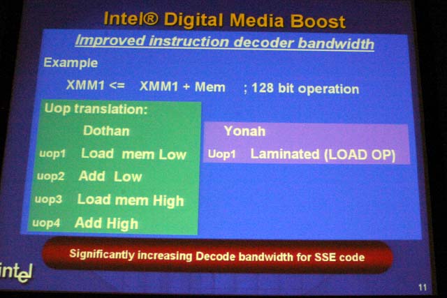 Yonah의 또 다른 특징은 Intel의 "Digital Media Boost"라고 부르는 미디어 처리 능력의 개선이다. Intel 모바일 마이크로 프로세서 그룹 CPU 검증 매니저 로니 코너 씨는 "Yonah는 내부 구조의 재검토에 의해, SSE 명령어 실행 효율을 개선하고 있다"라고 말하고, 그 구체적인 예로서 몇 가지 개선점을 보였다.