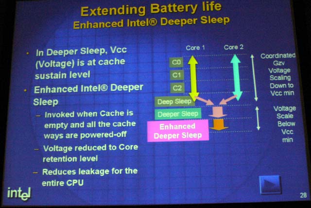 Intel은 Yonah에서 "Enhanced Deeper Sleep"또는 DC4라고 부르는 더욱 확장된 C4 상태를 추가하고 있다. 이 DC4는 L2 캐시에 공급되는 전압도 낮추고, CPU의 소비 전력을 낮춘다. 그러나 공급 전압을 낮추는 것은 L2 캐쉬의 전원을 끊는 것과 같은 것이므로, L2 캐시의 내부에 축적된 데이터를 메인 메모리에 대피시킬 필요가 있다. 따라서 Yonah는 DC4로 이행하기 전에 캐시의 내용을 메모리에 보낸 다음 DC4 상태로 이행하게 된다.