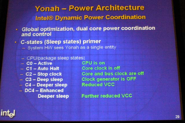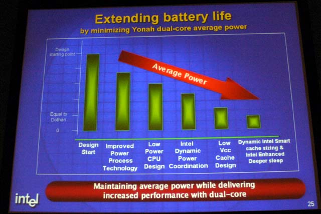 코너 씨는 "이 새로운 절전 기능 등으로 Yonah의 평균 소비 전력은 싱글 코어인 Dothan 코어의 Pentium M과 동일한 범위까지 낮출 수있게 됐다"라고 Yonah의 평균 소비 전력이 Dothan 과 동일한 범위까지 낮추는데 성공하고 있다고 설명했다.