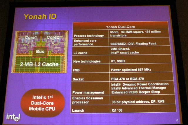23 일부터 미국 샌프란시스코에서 개최중인 Intel Developer Forum (IDF)에서 화제의 중심은 Intel이 "차세대 마이크로 아키텍처"라고 부르는 차세대 프로세서 "Merom (메롬, 개발 코드 네임)" 및 "Conroe (콘로 개발 코드 명)" 등 2006년 하반기에 출시될 CPU이지만, 2006년 1분기에 출시를 예정하고 있는 Napa 플랫폼의 첫 번째 CPU로 등장하는 "Yonah (요나 개발 코드명)" 라는 듀얼 코어 CPU에 대한 정보도 일부 업데이트 되어 있다.