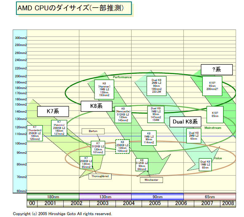 이번에 발표된 내용에서 재미있는 것은 AMD의 듀얼 코어 CPU의 die size (반도체 본체의 면적)이다. 아래가 AMD CPU의 다이 크기 목록으로 리비전이 바뀌면 다이도 미묘하게 변화하기 때문에 정확한 것은 아니지만 대충은 이러한 흐름으로 추이하고 있다. 이것을 보면, 0.13μm (130nm) 이상 라인업 다이 사이즈에는 명확한 법칙성이 있다는 것을 알 수 있다.