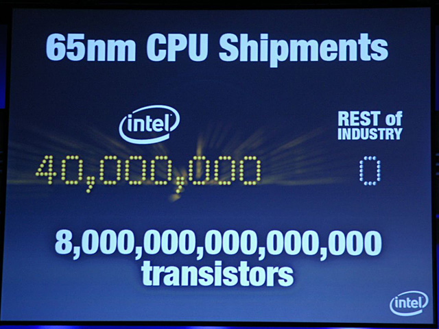 이러한 프로세서는 모든 Intel의 65nm 공정에서 양산된다. 이미 Intel이 출시한 65nm 공정의 프로세서의 수는 400 만개를 넘어 그 트랜지스터 수는 8,000 조 개를 돌파했다. 이 업계에서 65nm 공정의 로직 반도체 (프로세서 포함)를 출하 할 수 있는 것은 현재 Intel 밖에 없다.