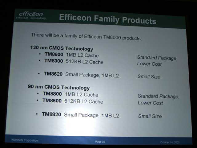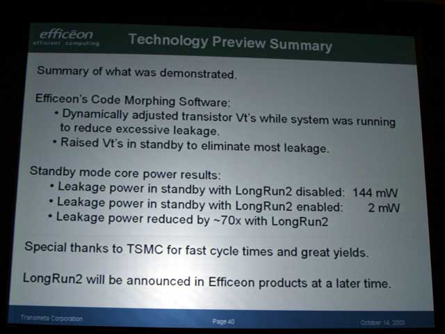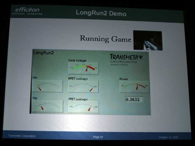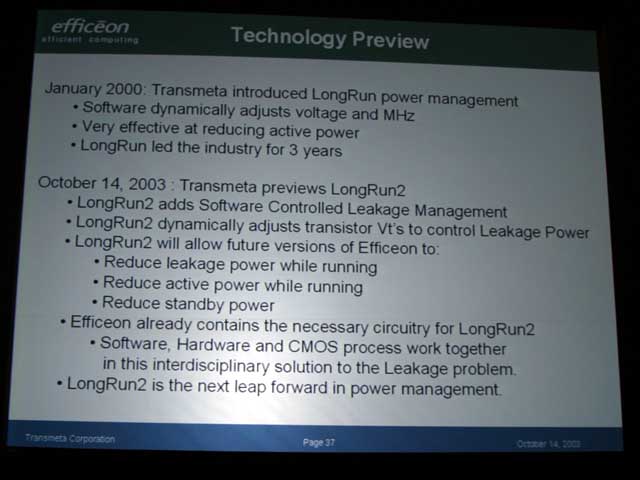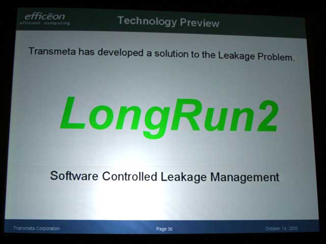 또한 이번 발표된 1세대 Efficeon 에는 이 LongRun2 기능은 탑재되어 있지 않다. 디첼 씨는 "미래의 Efficeon에는 LongRun2 기능을 탑재한다"고 설명하고, 디첼 씨가 밝힌 로드맵에서 설명된 90nm 공정판 내지는 65nm 공정판 등에서 채용될 것이다.