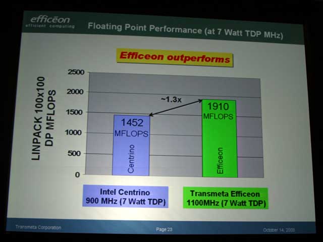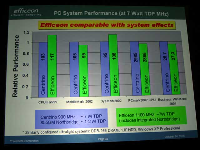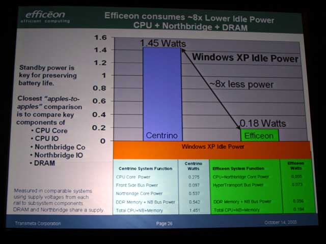 디첼 씨는 CPU + FSB + 노스 브릿지 + 메모리에서 초 저전압 판 Pentium M 900MHz와 TM8600 1.1GHz를 비교한 데이터를 제시 "Efficeon는 Pentium M에 비해 아이들시의 소비 전력은 무려 1/8" 이다 라고 말하며 그 상세한 데이터를 공개했다. 이에 의하면, Pentium M 900MHz에서 1.45W의 아이들 때의 소비 전력이 Efficeon 에서는 불과 0.18W에 불과하다 말한다.