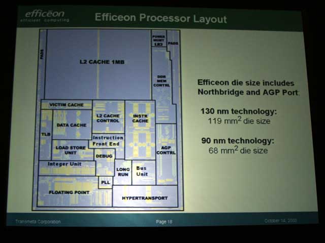 Efficeon의 평면도. 다이 크기는 0.13μm (130nm) 공정으로 119 제곱 mm,