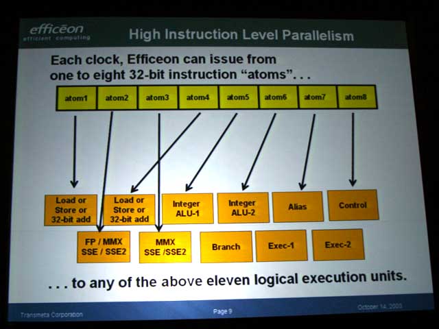 Efficeon에서는 11의 실행 유닛을 내장하고 있어, 이것으로 8개의 명령을 병렬로 실행