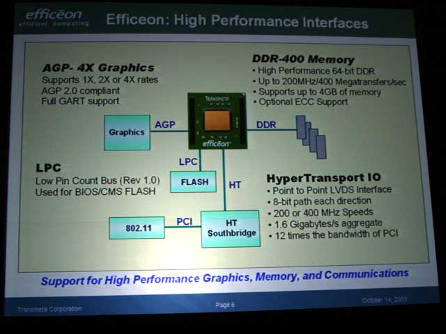 Efficeon도 Crusoe처럼 노스 브릿지 해당하는 기능도 통합되어 있다. 메인 메모리는 DDR400 까지 지원 가능하지만, JEDEC에서 DDR400의 SO-DIMM의 사양을 책정하고 있지 않기 때문에, 실제로는 DDR333까지가 실용이라는 것이다.