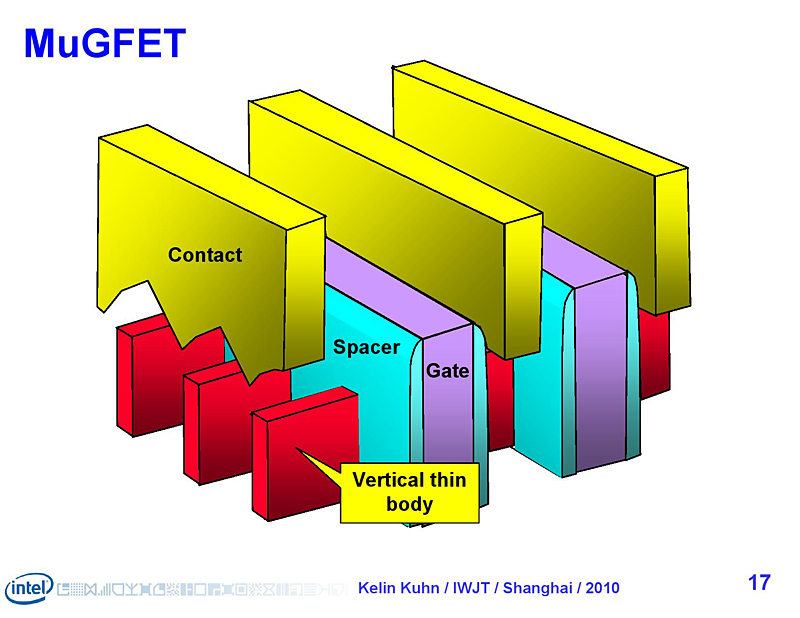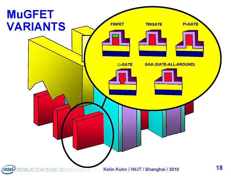 또한 Intel은 FinFET에서 채널 영역을 3방향에서 게이트에 둘렀기 때문에, 자사의 FinFET을 "트라이 게이트 트랜지스터 (Tri-Gate Transistor) '라고도 부른다. 좌우 2 면만을 게이트로 쓰는 경우 듀얼 게이트. 좁은 의미의 FinFET을 듀얼 게이트로, 트라이 게이트 FinFET과 구별하는 경우도 있다. 이 밖에 전체를 게이트로 둘러싼 GAA (게이트 올 어라운드) 등도 있어, 화제의 3D NAND 플래시 기술 V-NAND 셀이 방식을 채택했다. 아래는 Intel의 2010 International Workshop on junction technology 슬라이드로 MuGFET은 멀티 게이트 FET의 약자다.