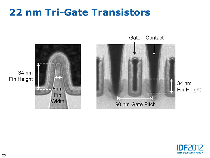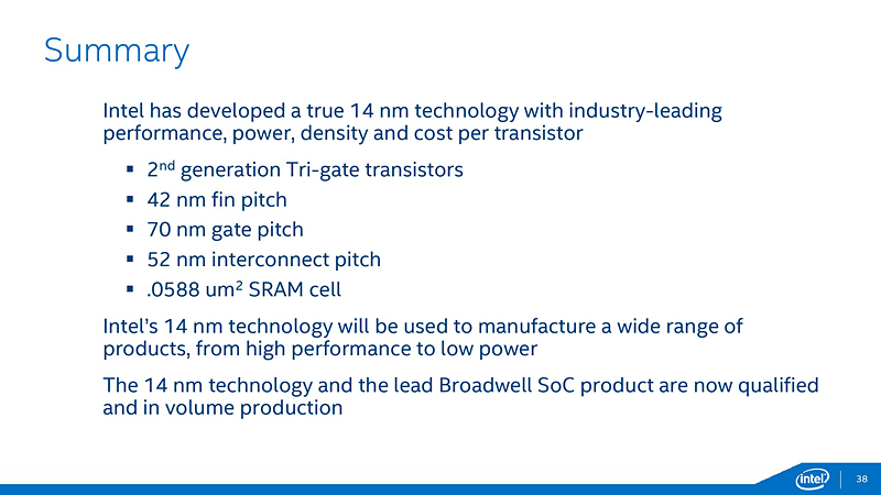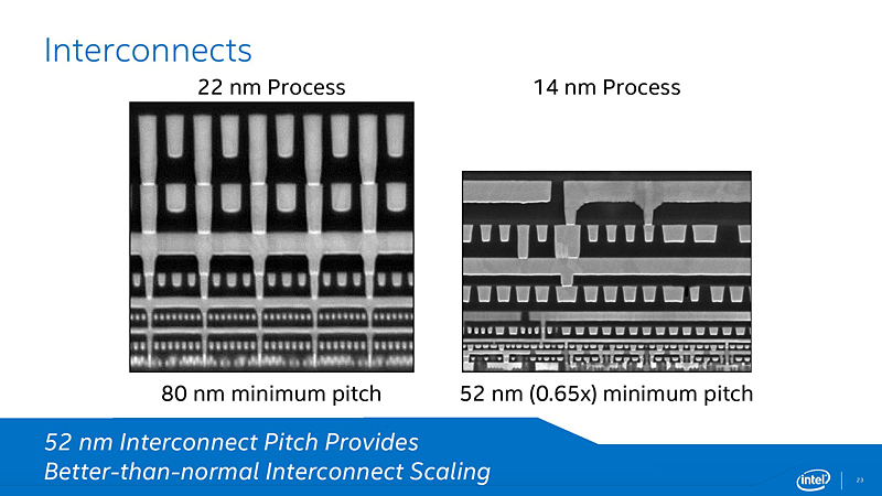 트랜지스터의 게이트 피치 (Gate Pitch)는 22nm 공정의 90nm에서 14nm 공정은 70nm로 78%로 축소했다. 인터커넥트 피치 (InterConnect Pitch)도 마찬가지로 22nm의 80nm에서 14nm에서 52nm로 이것은 65%로 축소했다. 3D 트랜지스터의 새로운 파라미터인 FinFET의 핀 피치, 즉 인접해 있는 핀의 간격은 22nm에 60nm에서 14nm에 42nm로 이것도 70% 나 축쇠했다. 이들은 어느쪽도 트랜지스터의 크기에 관련된 숫자다. 이들의 숫자가 보이는 것은, Intel은 22nm로 부터 14nm로 상당히 공격적인 스케일 다운을 한다는 것이다.