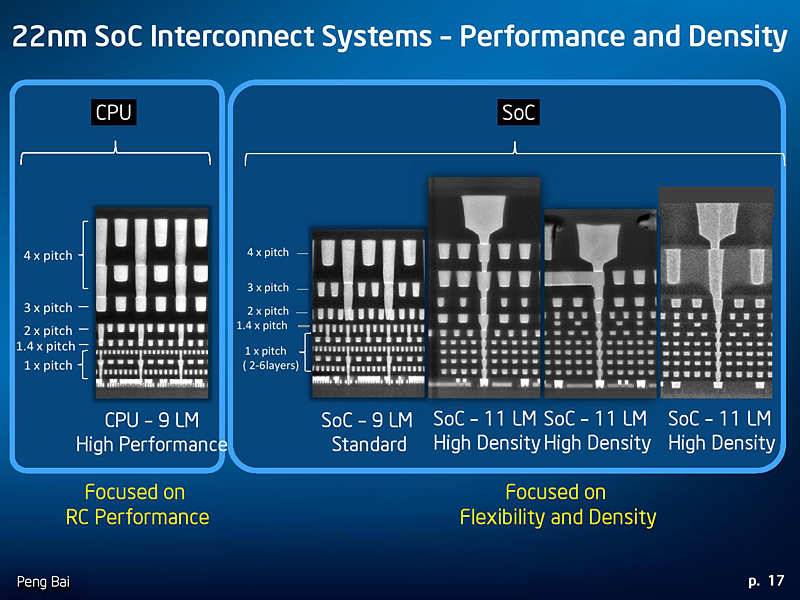 이번 Intel이 14nm 공정의 발표에 비교하는 것은 피치가 최소가 되는 M2 / M3 부분의 배선층의 피치이다. 22nm 공정에서는 80nm, 14nm 공정에서는 52nm로 Intel의 차트에 있으며, 22nm 쪽은 분명히 M2 / M3 이다. M1 층끼리의 피치의 비교가 아니다. Intel도 제대로 "Minimum Pitch" 라는 표현을 했다. 요주인 것은, 14nm의 52nm 라는 숫자는 M1 피치가 어떤지 모르는 점이다. 22nm를 보면, M1 피치는 52nm보다 간격이 넓은 가능성이 높다. 따라서 타사의 FinFET 공정의 공개된 스펙과 비교할 때 어떻게 비교할지 어렵다.