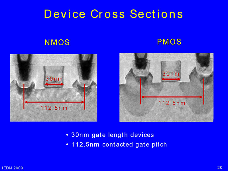 Intel의 14nm 공정에서 게이트 피치가 22nm보다 70%대로 좁아진 것은, 게이트 길이도 짧아졌을 가능성이 높다. FinFET의 원래의 목적의 하나는 게이트 길이의 단축이므로 당연한 방향이다. 라고 말하지만, Intel은 22nm 공정에서는 게이트 길이 (Lgate)는 30nm / 34nm / 40nm (트랜지스터의 종류에 따라 다름)로 비교적 길다. 32nm 공정도 30nm이기 때문에 게이트 길이 자체는 변함이 없었다. 그런데 게이트 피치는 32nm의 112.5nm에서 22nm에서는 90nm로 축소되었다. 22nm에서는 32nm로 부터 게이트 길이는 그대로 게이트 피치 정도만 감소했음을 알 수 있다.