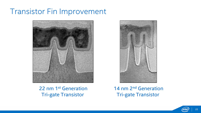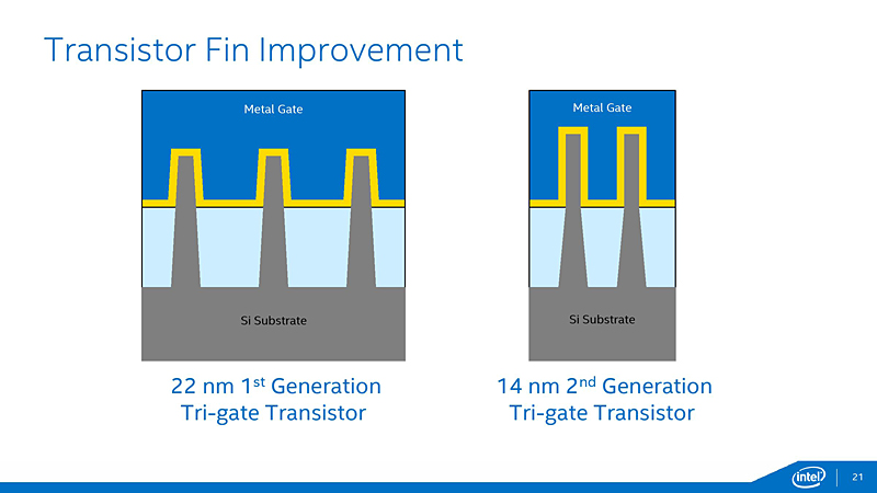 Intel은 22nm에서 3D 트랜지스터를 제품화 하는 것으로 경험을 쌓고, 그 결과, 14nm에서는 3D 트랜지스터 기술 자체를 더 진화시켰다. 일례로, 3D 트랜지스터는 핀형의 소스 - 채널 - 드레인의 높이를 제어하기 어렵다 (특히 벌크 FinFET은 어렵다). Intel은 22nm 공정에서는 핀의 높이는 34nm 였던 것을, 14nm 공정은 42nm로 23% 높였다. 따라서 개별 3D 트랜지스터의 전류 구동 능력이 큰폭으로 올랐다고 한다. 또한 핀의 간격도 22nm에서 60nm로 제법 넓게 가졌던 것을, 14nm 에서는 42nm로 축소했다.