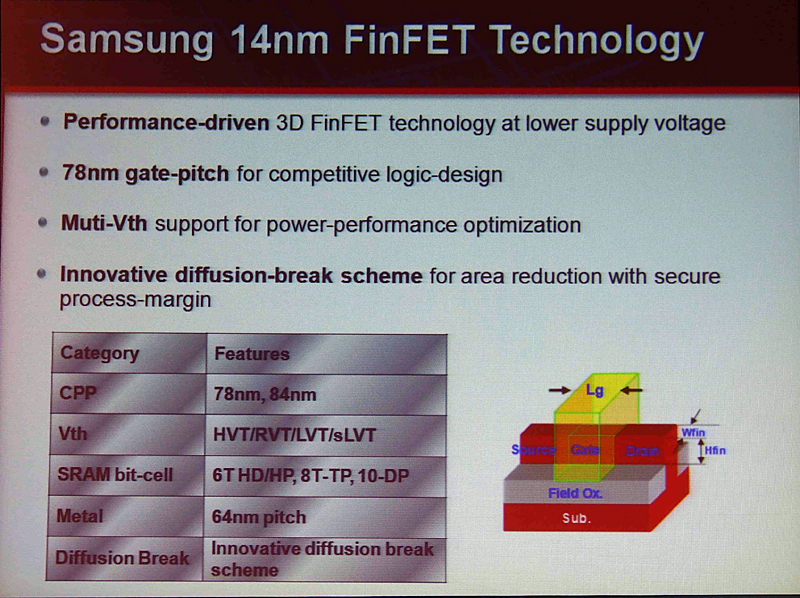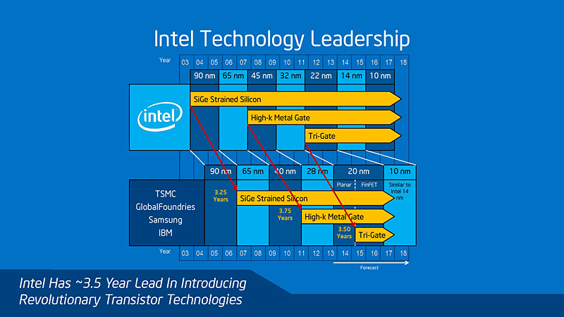 Intel의 14nm 게이트 피치를 타사 FinFET과 비교하면, Samsung의 첫 번째 FinFET 패밀리 "14LPE / 14LPP"는 CPP가 78nm, TSMC의 1세대 FinFET 공정 "16FF"는 게이트 피치가 90nm 이지만 후속 "16FF +"는 아마 90nm 보다 축소한다. Intel의 14nm 게이트 피치는 파운드리의 14 / 16nm 세대 공정보다 작은 것을 알 수있다. 덧붙여, TSMC의 16FF는 작년 (2013년)의 IEDM의 논문을 보면 게이트 길이가 30nm / 34nm이며, 게이트 길이도 Intel의 22nm 세대와 같다.