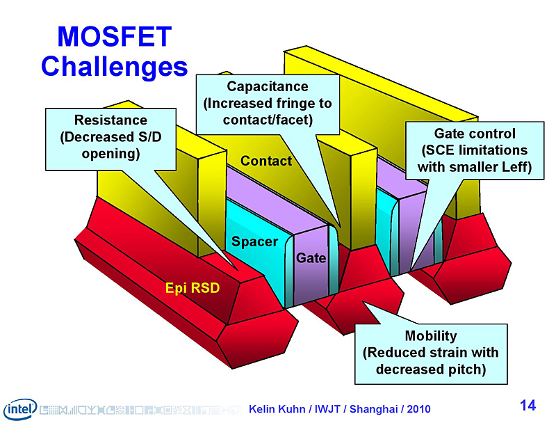 그러나 평면 2D 트랜지스터는 단 채널 효과의 악화를 방지하기 위해 게이트 길이를 줄이는 것이 어려워 트랜지스터 크기의 축소가 막히고 있었다. 이에 따라 20nm 공정 이후에 스케일 다운하기 위한 해결책으로 3D 트랜지스터가 떠올랐다 (또 하나의 해결책은 FD-SOI) 라는 경위가 있다. 즉, 16 / 14nm부터는 FinFET 과 FD-SOI 밖에 도망갈 길이 없어졌다.