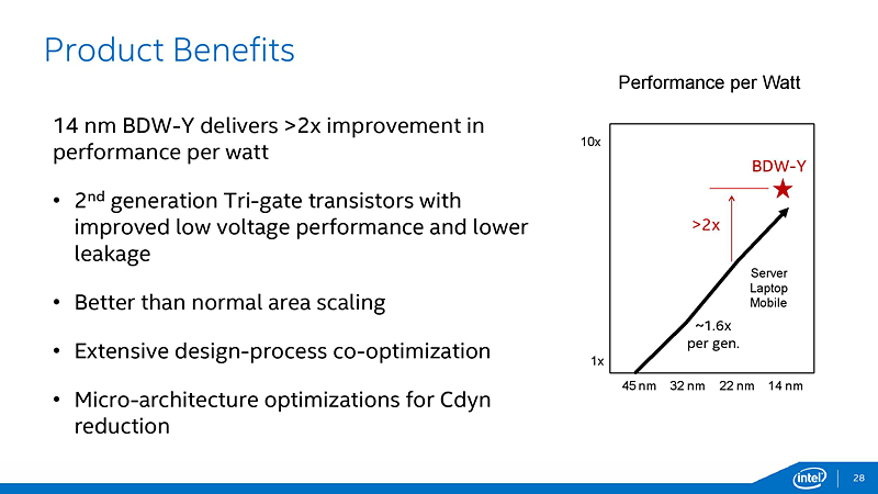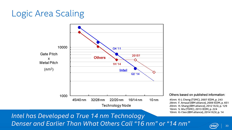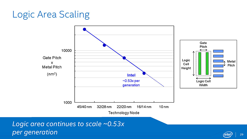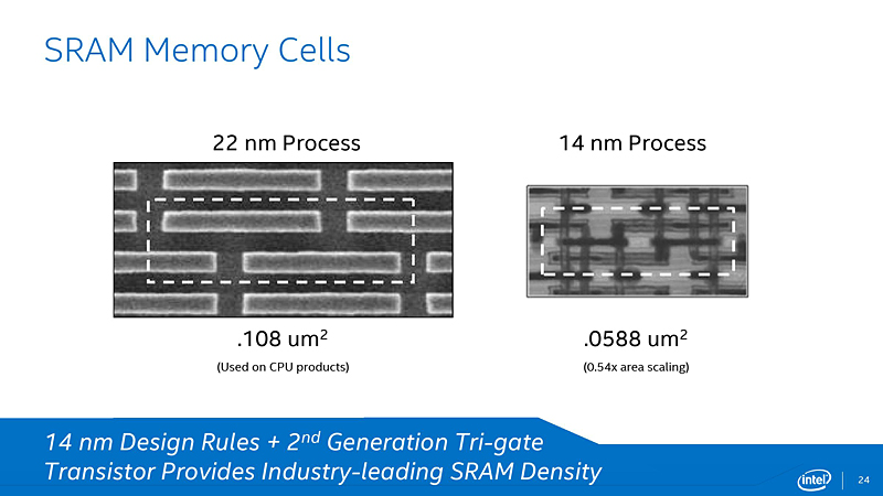 Intel이 트랜지스터의 에리어 스케일링의 기준으로 하는 것은 게이트 피치 × 메탈 피치의 면적이다. 게이트 피치는 22nm 노드로 부터 14nm 노드로 90nm에서 70nm로 78% 축소했다. 이것은 32nm 노드의 112.5nm에서 22nm로 80%의 축소보다 비율이 약간 높다.