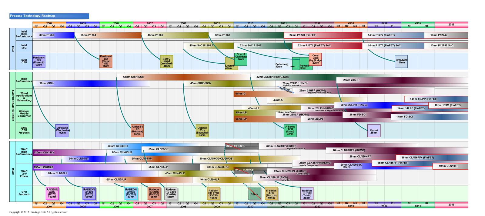 덧붙여, 현재로는 공정 노드의 숫자는 단순히 자사 대비의 "라벨"같은 것이다. 따라서 자세하게 각 피쳐 사이즈의 파라메터를 확인 안하면 비교 할수 없다. Intel도 "16nm"라는 노드 숫자로 부터 자사의 "14nm"라는 노드 숫자보다 낮다는 단순한 라벨의 비교 등은 하지 않는다. Intel은 14nm의 발표에서, 게이트 피치 × 메탈 피치의 비교를 근거로 로직 영역에 대해 TSMC의 16FF 공정 (16FF + 에는 아닌)에 대해 우위를 말하고 있었다.