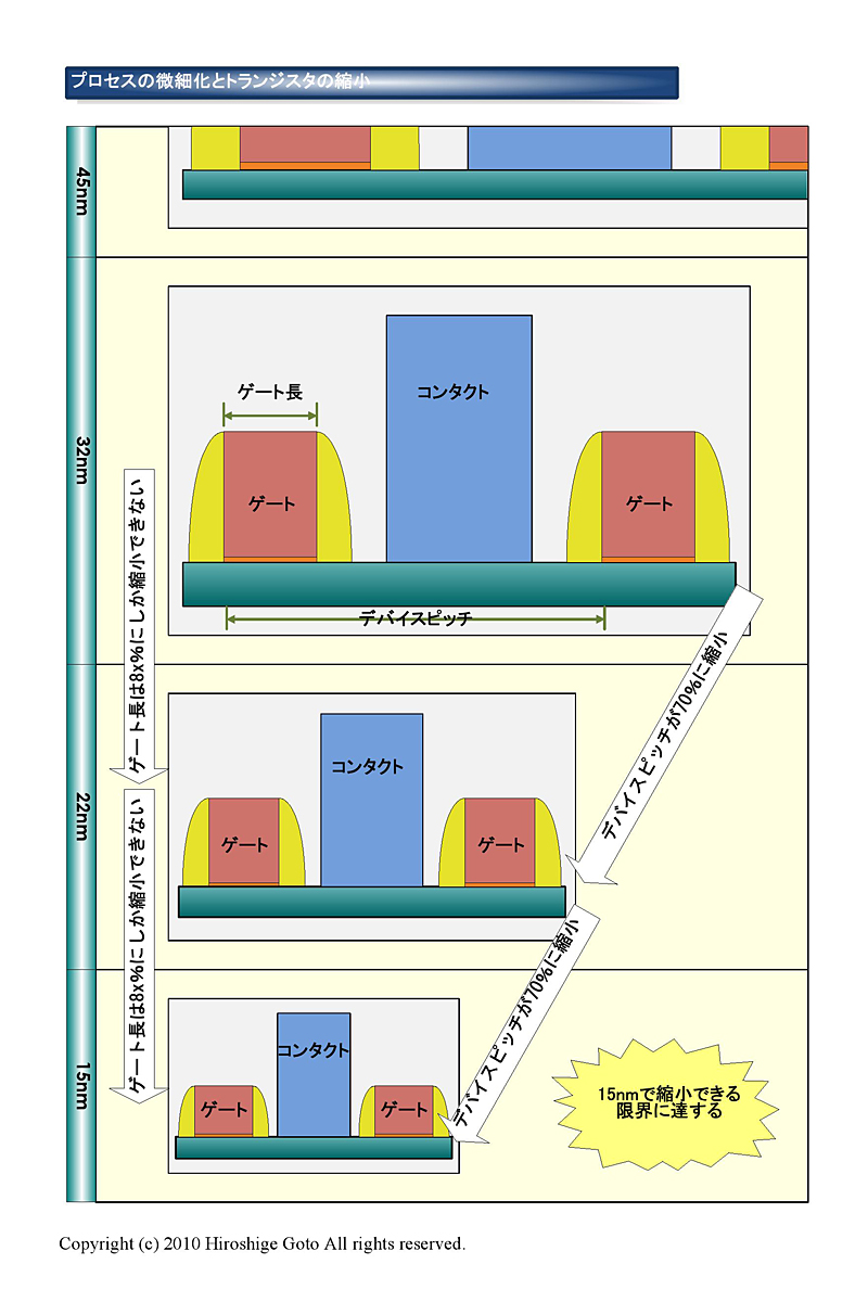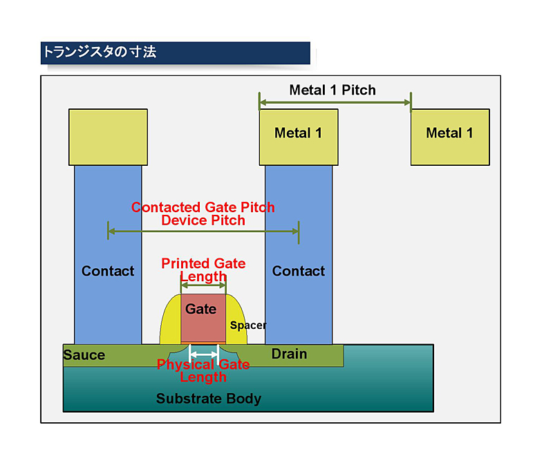 게이트 피치는 트랜지스터의 길이를 결정하는 중요한 파라메터 이다. 그것이 78%로 축소된 것은 트랜지스터의 크기가 그만큼 작아지는 것을 의미한다. 덧붙여, 게이트 피치에 해당하는 치수는, 디바이스 피치 (Device Pitch)나 트랜지스터 피치 (Transistor Pitch), CPP (Contacted Poly Pitch) 등도 사용된다. 이들은 재는 위치가 다른 것도 있지만 모두 기본적으로 게이트의 간격 또는 컨택트의 간격, 즉 트랜지스터의 길이에 관한 파라미터다.
