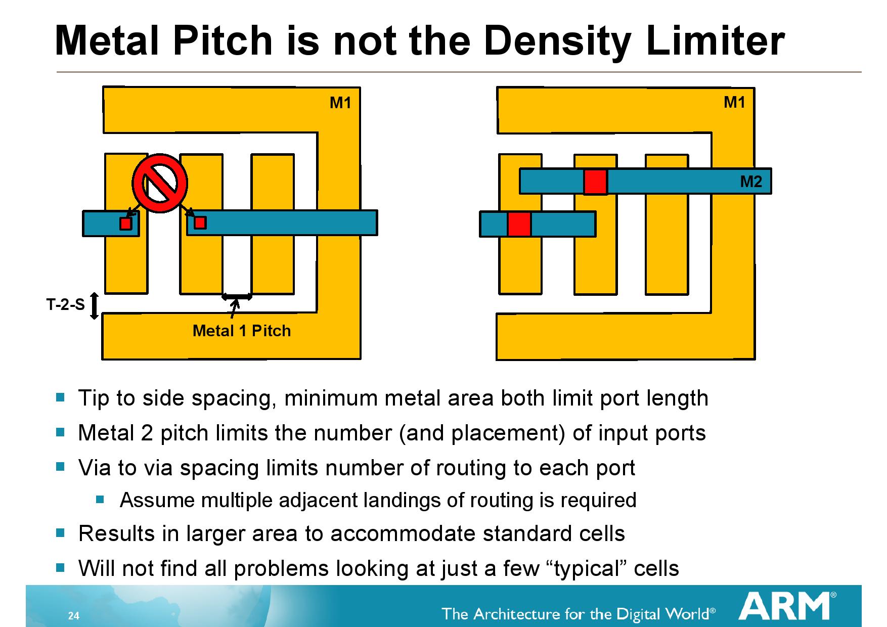아래는 ARM이 올해의 "International Symposium on Physical Design (ISPD)"의 기조 강연 "Physical Design and FinFETs" 에서 설명한 슬라이드로, 이것을 보면 Intel이 로직 프공정에서 M2의 간격을 좁히는 이유가 잘 이해된다. 입력 포트를 좌우하는 것은 M2이므로, M2의 간격이 중요하다.