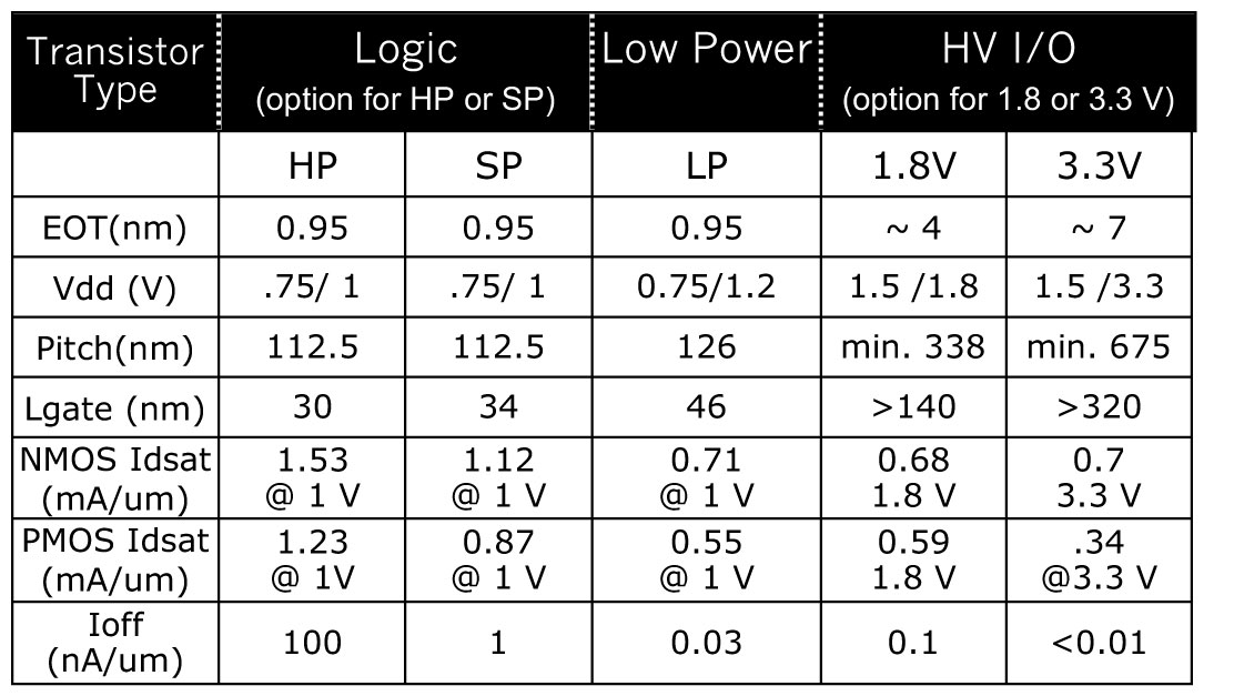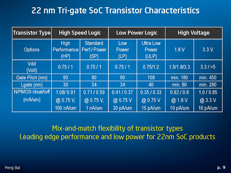 Intel의 22nm 공정의 트랜지스터 옵션 사양