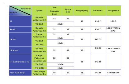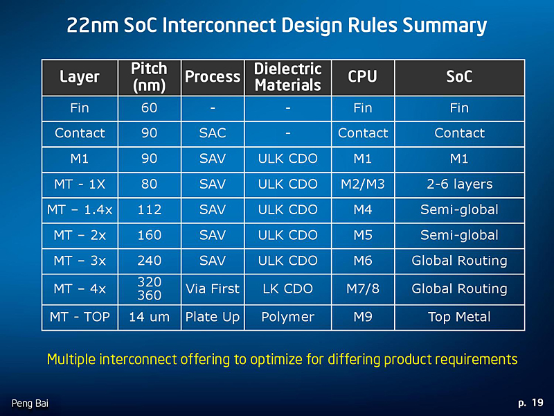 위는 Intel의 22nm 공정의 인터커넥트 스펙이다. 22nm에서는 M1이 90nm 피치로, CPU용 공정에서는 M2 / M3가 80nm 피치, SoC용 공정에서는 M2부터 2 ~ 6 층이 80nm 피치가 된다. 즉, M2의 것이 M1보다 10nm 정도 피치가 좁다. 덧붙여, 32nm에서는 M1도 M2도 112.5nm로 다르지 않다.